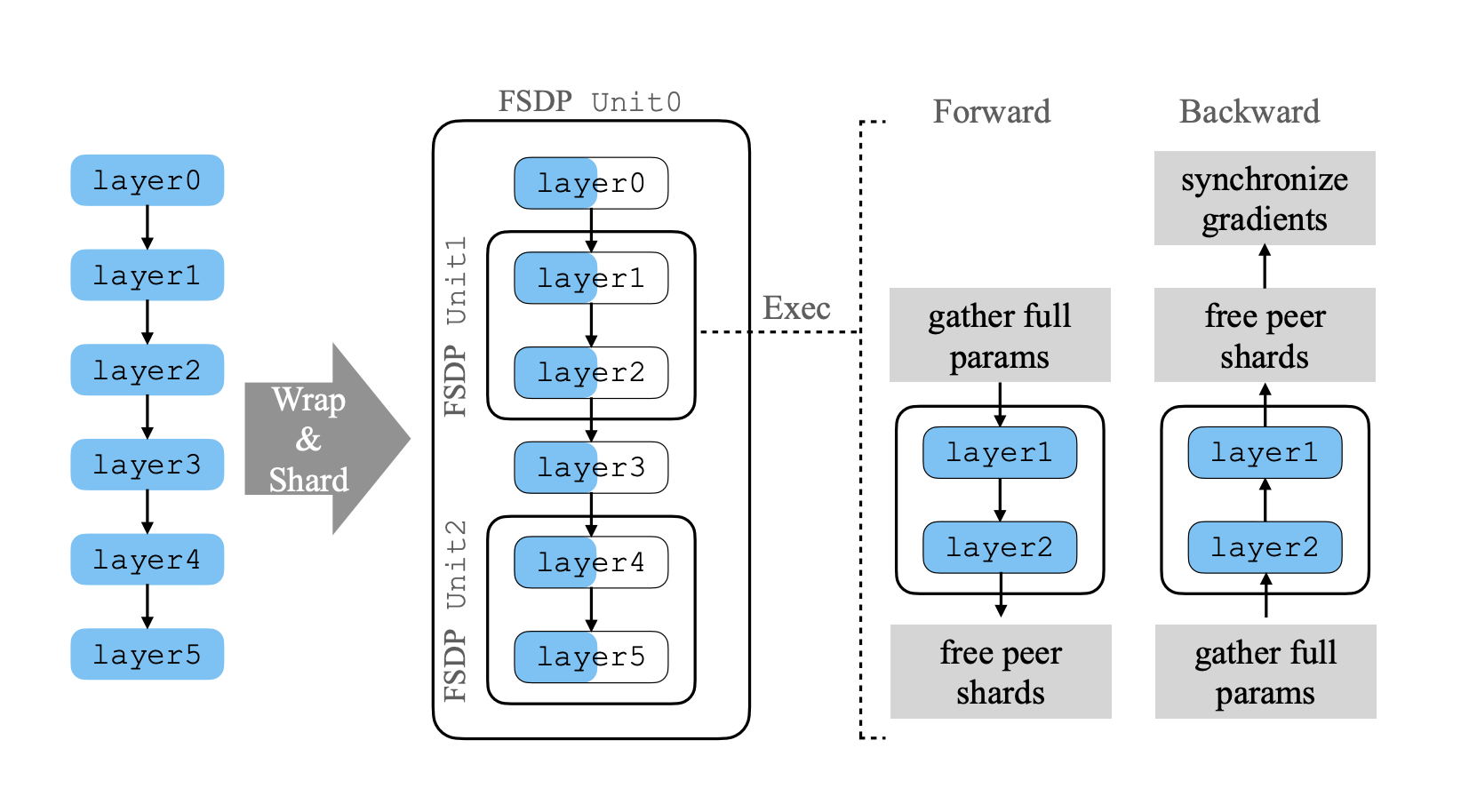 !!! 注意,FSDP 不涉及张量并行或者模型并行的概念,它只用 sharding 来存储参数,用 gather 来随时收集分散的参数,此外和正常计算一样,计算方式上没有任何改变。