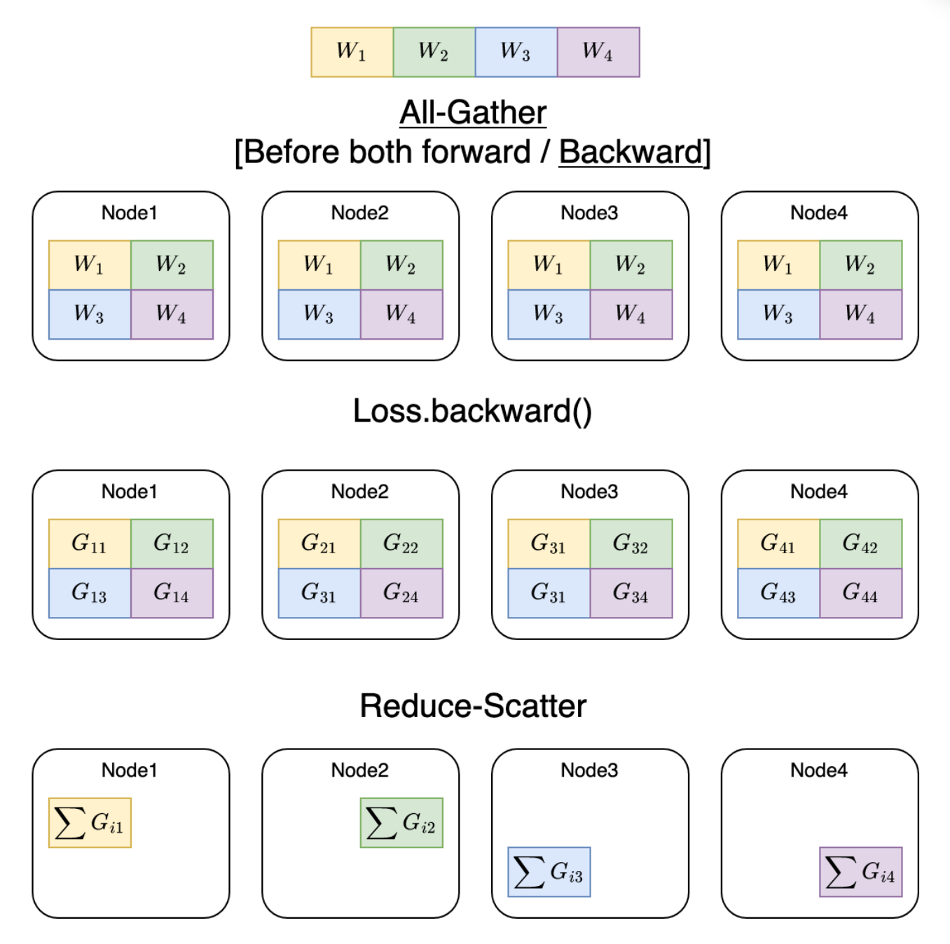 这里以一个 Linear 层为例,现在共有 4 个节点,我们把 linear 层平均的分散到每个 gpu 上,每个 gpu 只有一部分,不足以直接计算,现在 FWD 和 BWD 时,每个节点以 all-gather 的形式将所有节点上的 shard 收集为完整的 linear 层,这样每个节点都可以基于它自己的数据计算出输出,现在这个输出可以转到下一个层的计算,也是同样的 all-gather,而已经用的层,后续不再需要,因此直接释放,还是只保留原本的 shard。