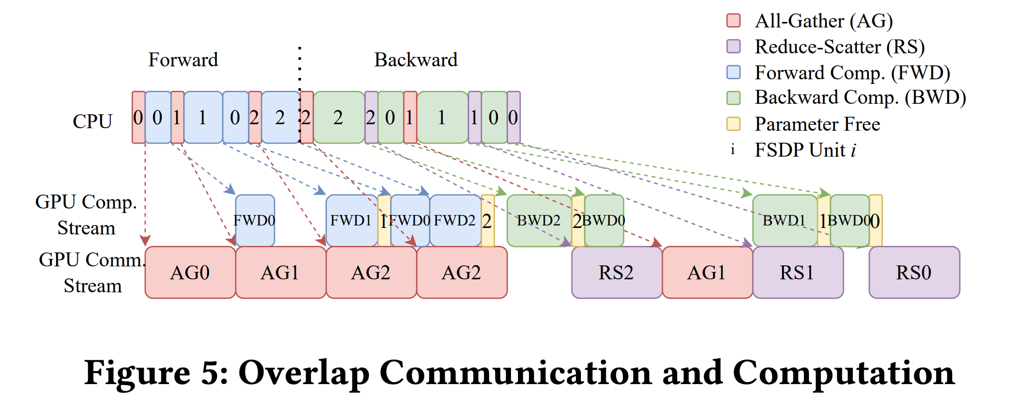 再从计算和通信上看,在进行完 AG0 (all-gather layer 0)时可以同时 FWD0 和 AG1,此时通信和计算就会overlap,但不影响双方。