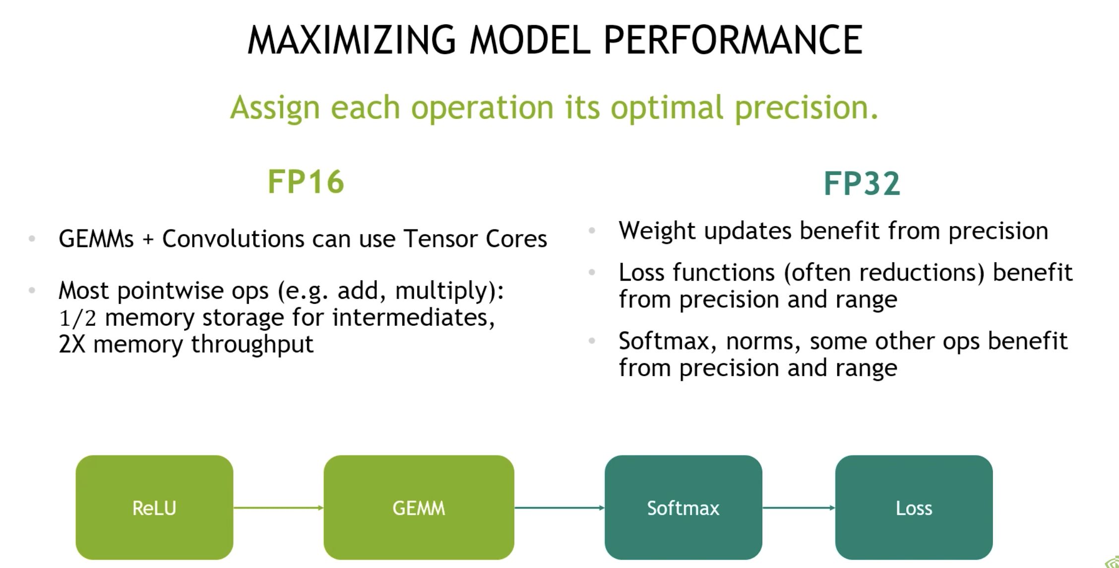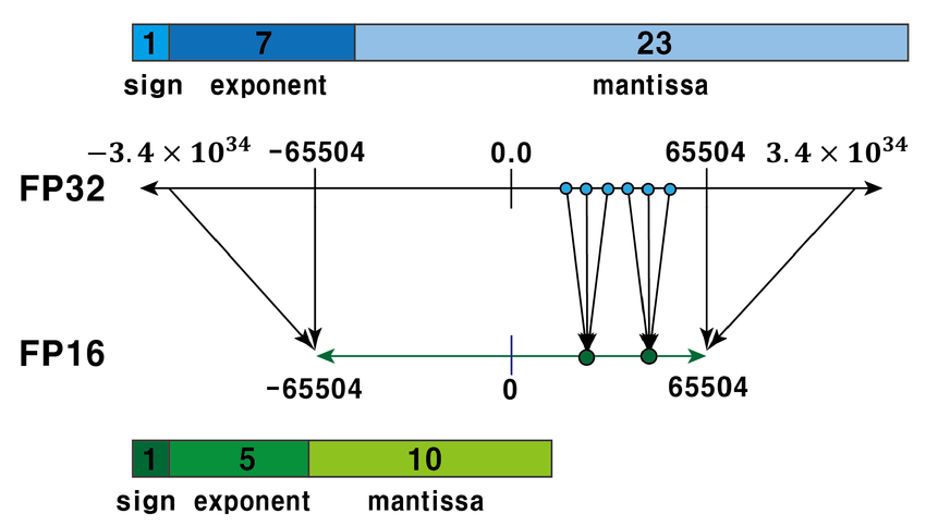 因此 fp16 被用于计算要求没那么高的计算上,而计算要求高的(如loss经常会被reduce到一个值,微调时较小的梯度需要更大的表示范围)则用 fp32。