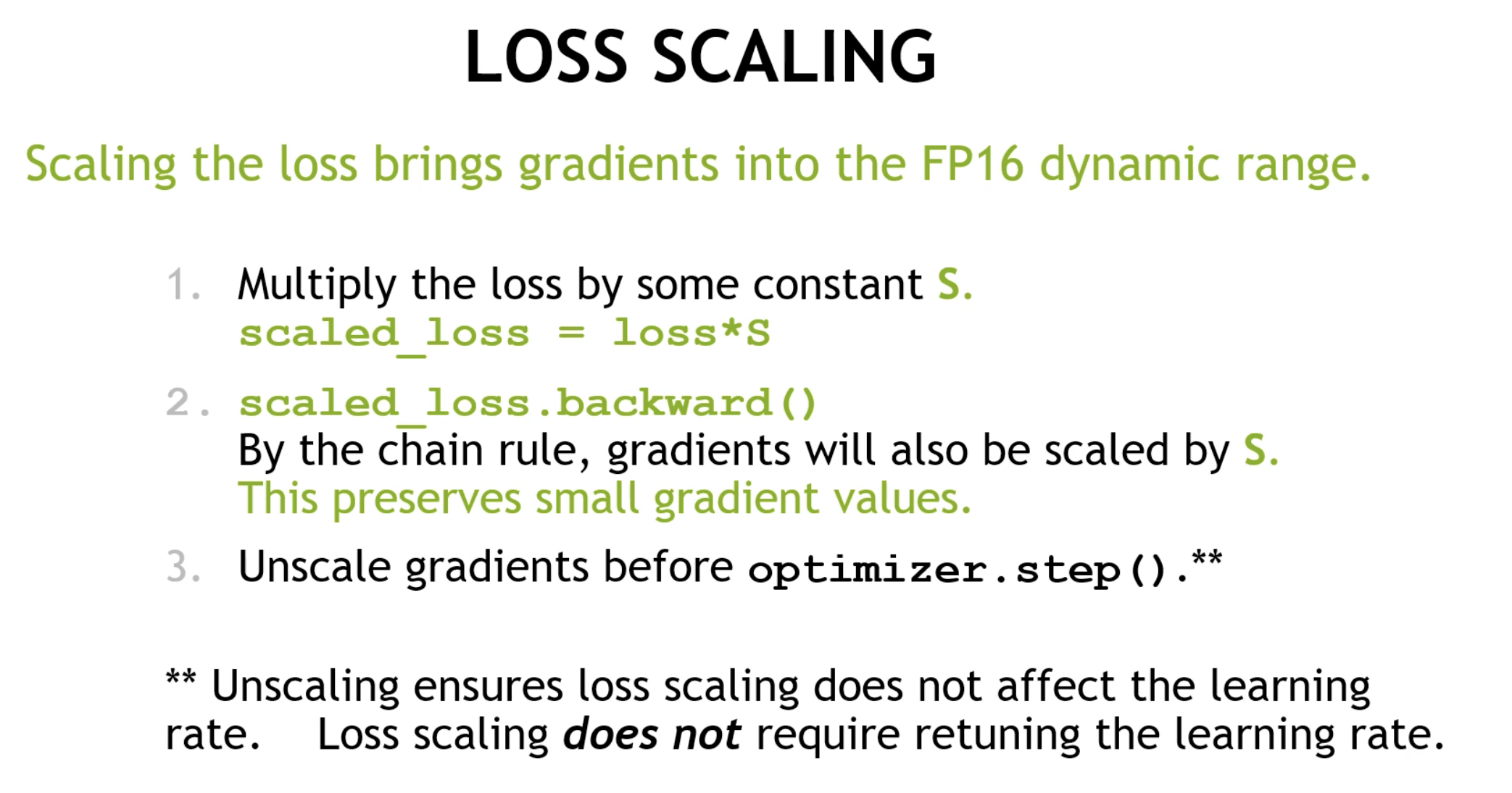 i.e., 前向传播计算 loss 时将其放大,使得对应的梯度也被同样的放大,能够正常的被 fp16 表示,在更新梯度前再除以 scale。